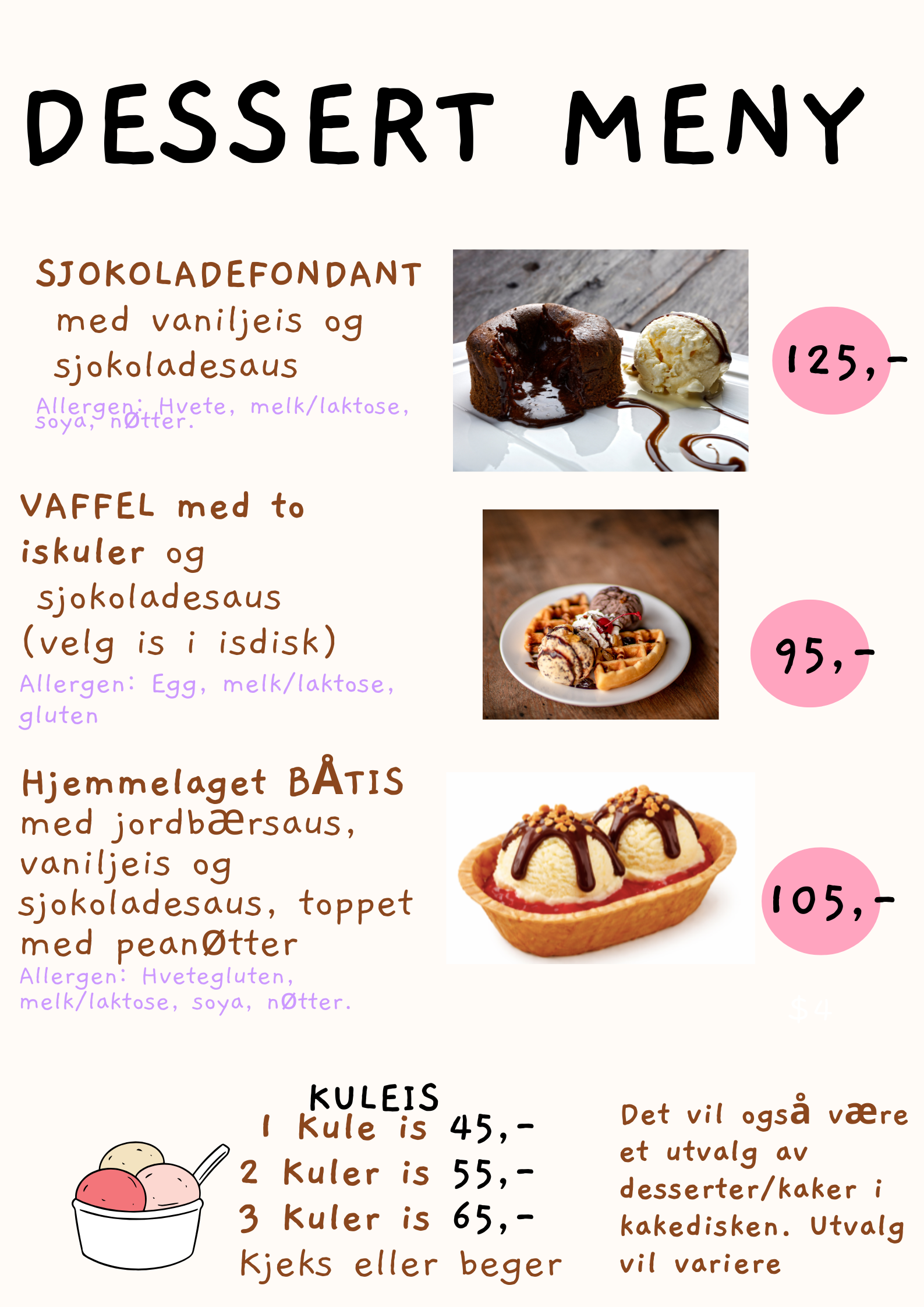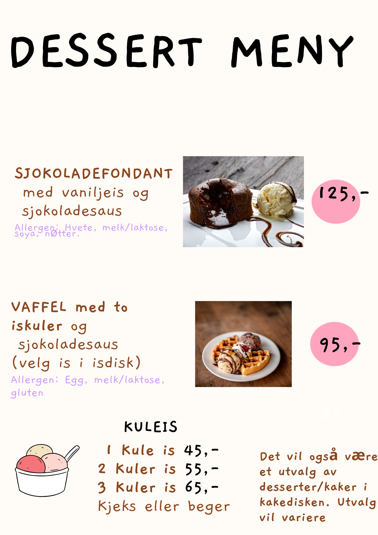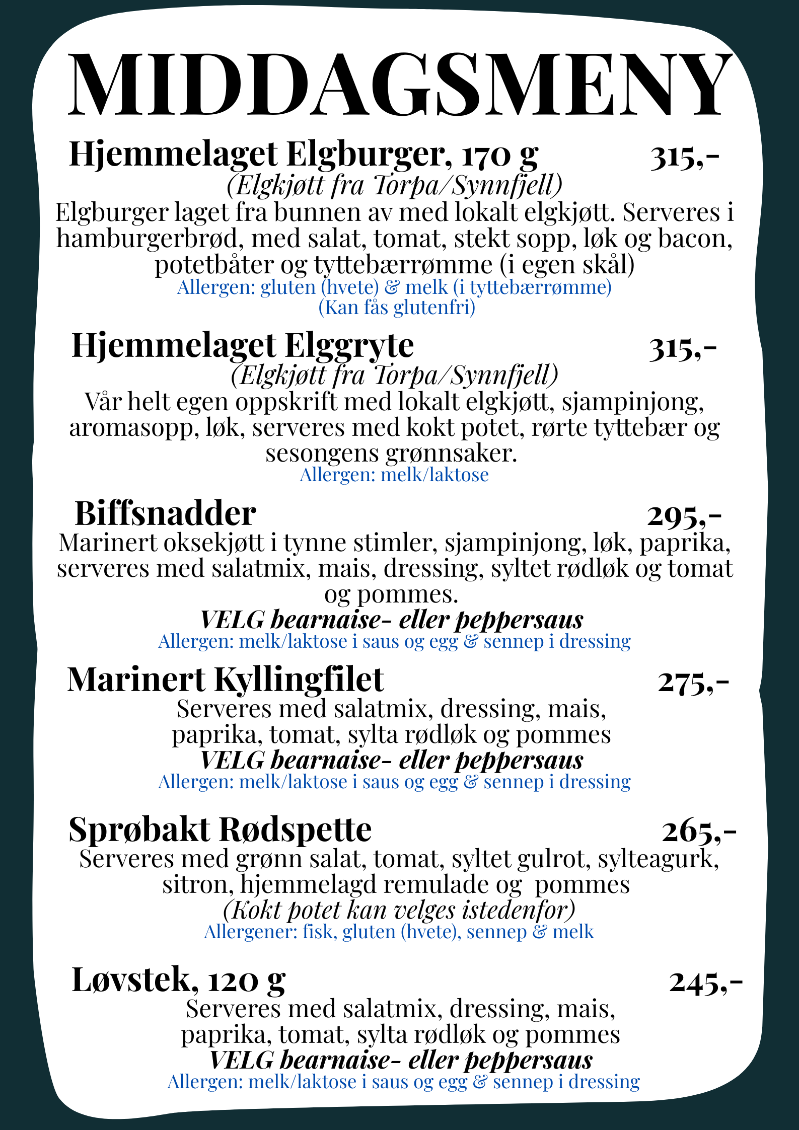 I ferier og høytider kan utvalget på menyen variere.